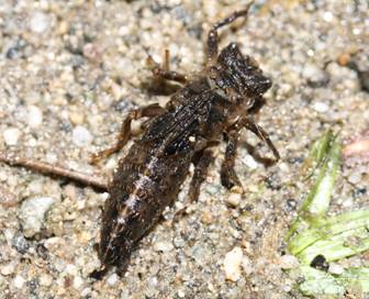 with wings held at 90 degree angle from body when at rest. Right.-Dragonfly nymph.