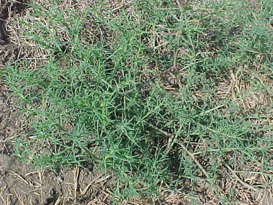 Identifying Characteristics. Mature plants are round in outline, considerably branched, ½ to 3 feet tall with red to purple striped stems. The leaves in seedling plants are long, fleshy and soft. Mature leaves are alternate, short, scale-like with a terminal spine. Flowers are inconspicuous, green and located in upper leaf axils. There is a similar species, barbwire Russian thistle that is similar in appearance by is typically more coarse and robust with stronger spines on the leaves. Identification